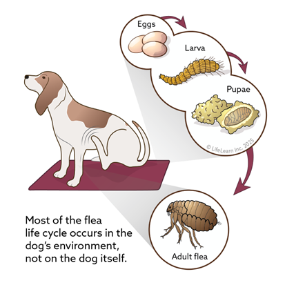 Newly hatched adult fleas jump onto a host animal to complete their life cycle. Within two days of eating a blood meal from the host and mating, the female flea begins to lay eggs, which then drop off into the environment, and the cycle starts again, spreading fleas to more animals. Under ideal conditions, the flea can complete its entire life cycle in as little as two weeks; in adverse conditions, the cycle can take as much as a year.