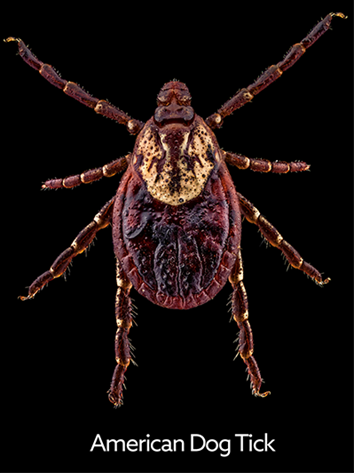 The American dog tick feeds on a wide variety of hosts, including humans and dogs, but rarely infests homes. Adults are chestnut brown with white spots or streaks on their backs.